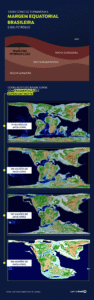 “[A Margem Equatorial] começou a quebrar a partir do noroeste e foi seguindo para dentro do continente. Ou seja, veio das Guianas, do Amapá, entrou no Pará, Maranhão e depois seguiu para o Rio Grande do Norte. [A fragmentação] veio progredindo também de sudeste para noroeste, ali da Bacia de Potiguar em direção à Bacia da Foz do Amazonas”, explica o geólogo.