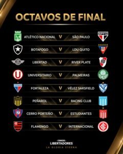 O clássico Flamengo x Internacional será o único jogo 100% brasileiro nas oitavas de final (mata-mata) da Copa Libertadores da América, cujos confrontos foram sorteados nesta segunda-feira (2), na sede da Confederação Sul-Americana de Futebol (Conmebol), em Luque (Paraguai). O país conta ainda com outros quatro clubes no torneio continental, entre eles está o atual campeão Botafogo, que fará o jogo de ida contra a LDU (Equador), na capital Quito.