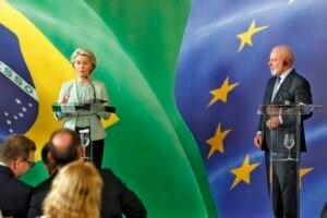 “Não nos limitaremos ao eterno papel de exportador de commodities. Queremos produzir e vender bens industriais de maior valor agregado”, disse ele, que destacou que o acordo prevê incentivos para investimentos de empresas europeias no Mercosul, o que inclui cadeias de valor estratégicas para transição energética e transmissão digital.