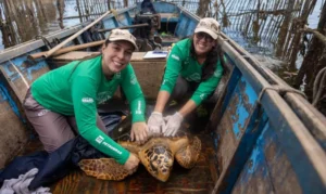 O reaparecimento de tartarugas-cabeçudas na Baía de Guanabara, no Rio de Janeiro, tem chamado a atenção de pesquisadores e pescadores artesanais e pode revelar novas informações sobre o comportamento da espécie ameaçada de extinção. (foto: biólogas Larissa Araujo e Suzana Guimarães com tartarugas-cabeçudas)